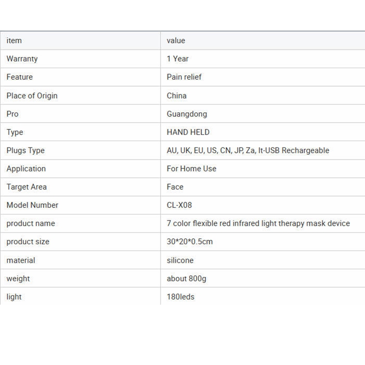 இதுசிவப்பு எல்.ஈ.டி ஒளி சிகிச்சை முக முகமூடி7 வண்ணங்களில் வடிவமைக்கப்பட்டுள்ளது.நீங்கள் உங்கள் சொந்த தேவைகளுக்கு ஏற்ப வண்ணத்தை மாற்றலாம், இந்த தயாரிப்பு 180 எல்.ஈ.டிகளுடன் வடிவமைக்கப்பட்டுள்ளது மற்றும் தொலை கட்டுப்பாட்டுடன் வருகிறது. சார்ஜ் செய்த பின்னர், நீங்கள் பயன்படுத்த விரும்பும் எந்த இடத்திற்கும் அதை எடுத்துச் செல்லலாம், இது மிகவும் வசதியானது.