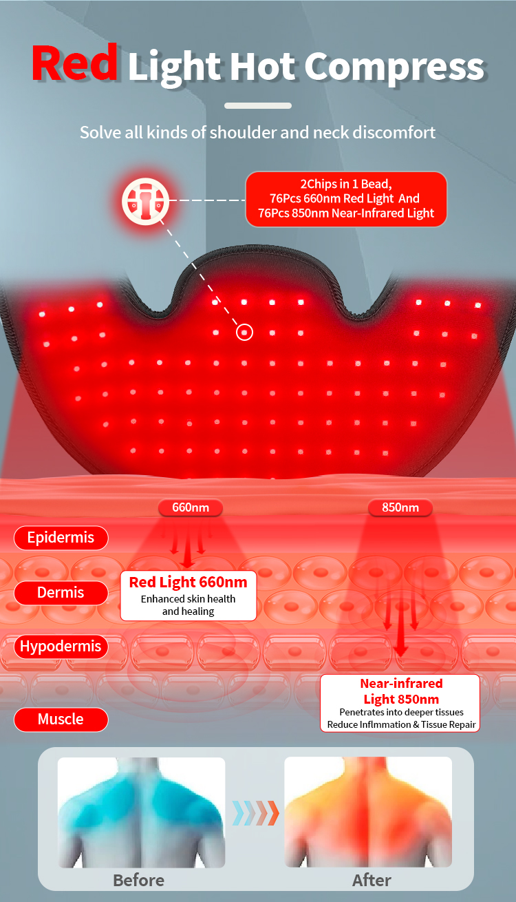 இந்த சிவப்பு மற்றும் அருகிலுள்ள அகச்சிவப்பு ஒளி சிகிச்சையானது உடலில் வலியைக் குறைக்கவும், தசைகளை தளர்த்தவும் பயன்படுத்தலாம், மேலும் இது பல்துறை மற்றும் சிறியதாகும். எல்.ஈ.டி சிகிச்சை ஒளி தோள்பட்டை இடுப்பு பெல்ட் உயர்தர மற்றும் மென்மையான துணியால் ஆனது, இது உங்கள் சருமத்திற்கு எதிராக வசதியான தொடுதலை வழங்குகிறது. லீடி சிகிச்சை ஒளி தோள்பட்டை இடுப்பு பெல்ட் தோள்பட்டை மற்றும் கழுத்து ஆரோக்கியத்திற்கு ஆக்கிரமிப்பு அல்லாத உடல் சிகிச்சையின் மூலம் வசதியான தினசரி பராமரிப்பு தீர்வை வழங்குகிறது, குறிப்பாக தோள்பட்டை மற்றும் கழுத்து சிக்கல்களை நீண்ட கால கண்டிஷனிங் தேவைப்படும் நபர்களுக்கு ஏற்றது.